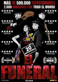 ¿De qué va El Funeral? Va de enterrar al abuelo Dimitri, va de celebrar la vida, va de prestarle atención a las cosas importantes, pero no bloquearse cuando no salen, va de hacerse entender en mil idiomas, va de huir y de volver, va de reunirse, de invitar. O tal vez de ninguna cosa de estas. Va de lo que cada espectador siente ante las brillantes interpretaciones individuales y de la explosión colectiva de la risa. Un grupo de músicos zíngaros invitan al público a celebrar el funeral de su abuelo Dimitri, una sencilla trama convertirá todo en un lío lleno de situaciones increíbles. Unos personajes explosivos el virtuosismo musical y la interacción con el público hacen de este funeral una increíble fiesta difícil de olvidar. Un espectáculo diferente y original de música y teatro donde la diversión, la espectacularidad y un argumento increíble se conjugan para hacer pasar al público una jornada inolvidable llena de sorpresas y humor.